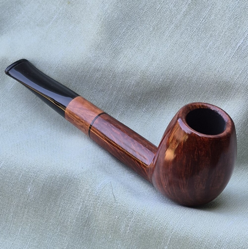 The briar bowl is halfway between Brandy and Egg style. The bowl features swirling flame grain with some Birdseye, which continues along the shank.  The very long, cylindrical shank is slightly conic and as a result looks even longer to the eye thanks to the briar insert on the mouthpiece.