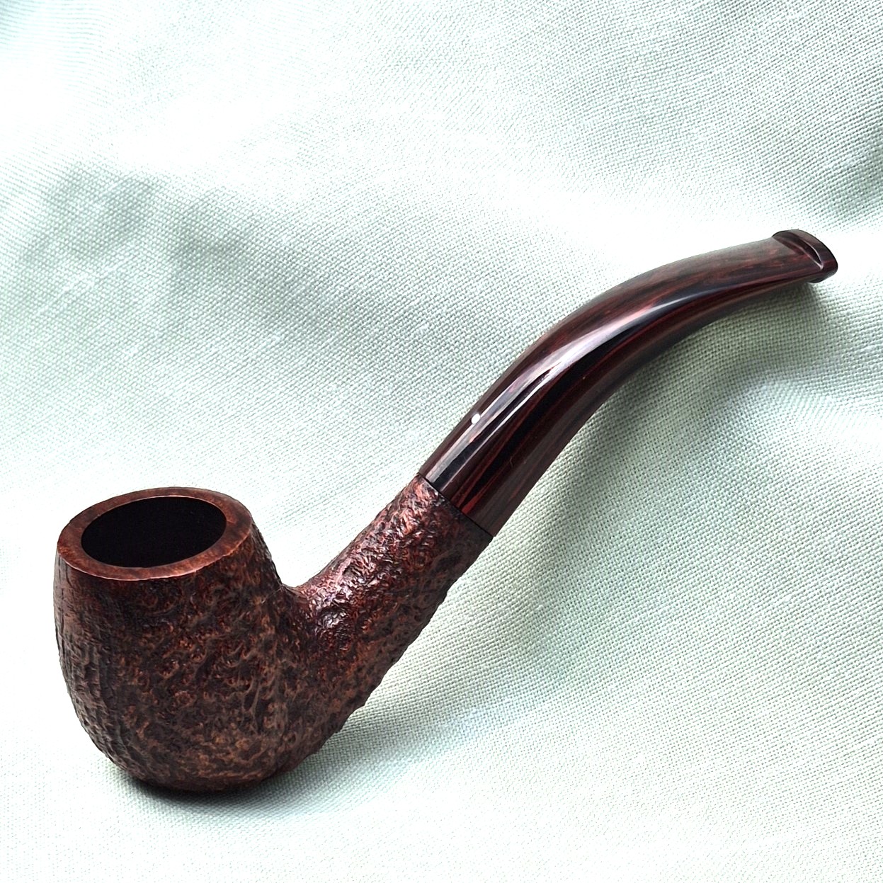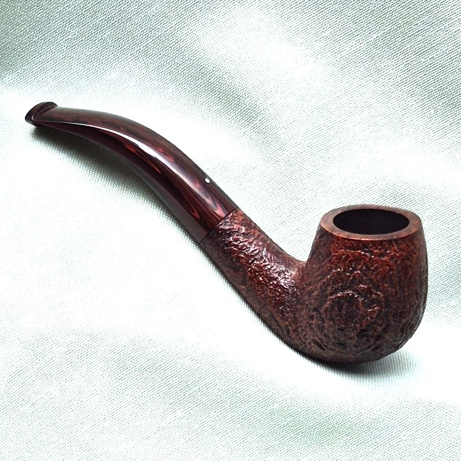 • This finish was introduced in 1980 and how beautiful it is. Rich, polished, oxblood-colour stain brings a glow to the deep sandblasted briar. And, I guess at the same time, a new, brown marbled colour vulcanite was developed to tone with the colour of the briar – they called it the “Cumberland” mouthpiece. With most Cumberland pipes it is the matching of the colours on the two different surfaces that really pleases the eye and feel.