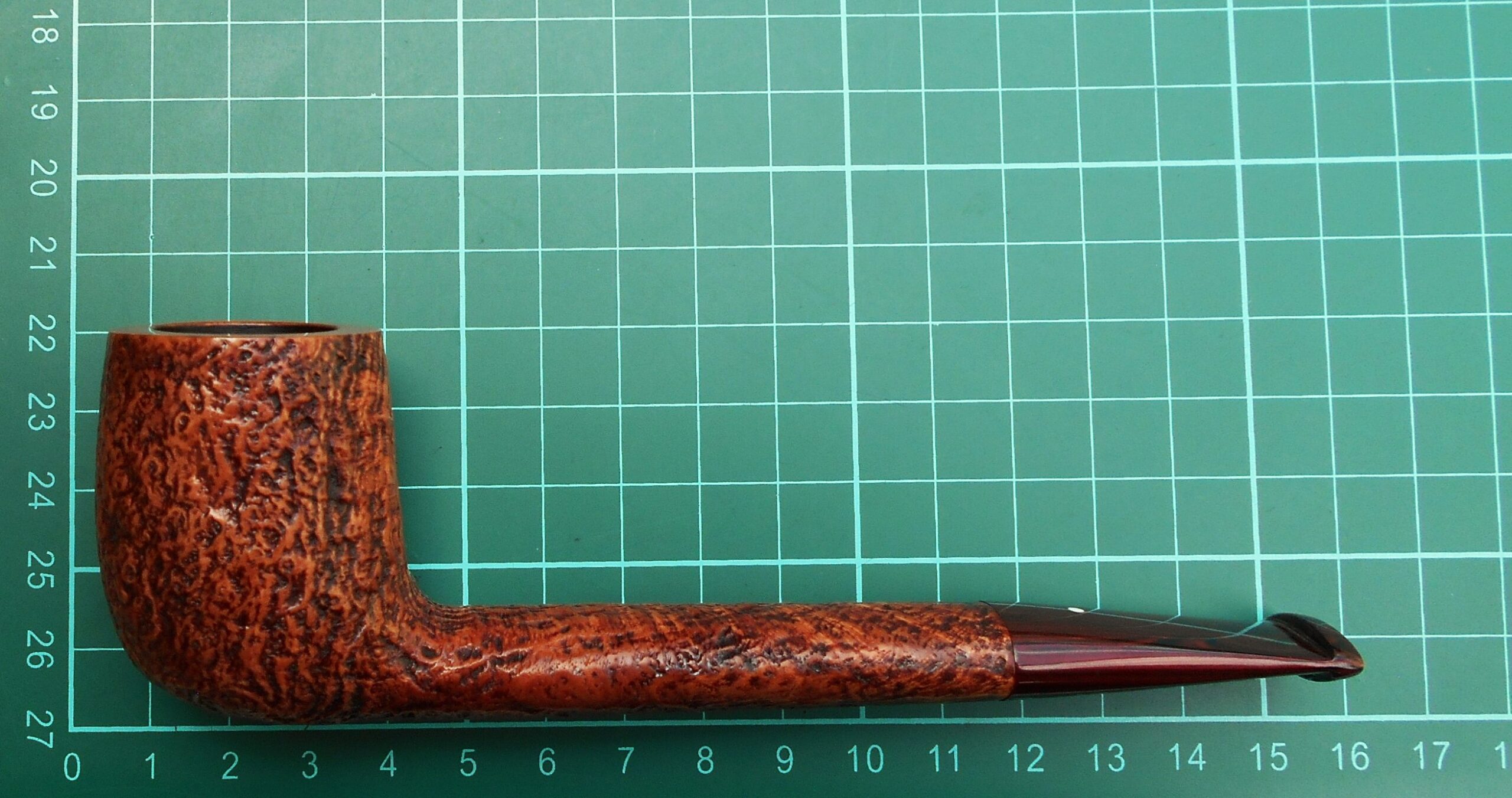 • The bowls have had the soft wood on the surface sandblasted off. Any weak bowls shatter under this process. The survivors are remarkably tough and light. The shell briar is usually a little thinner-walled than its smooth counterpart and may need a little more care in building up the carbon layer. In order to accommodate the stamping on a sandblasted pipe it is necessary to smooth and level the base of the stem. A benefit of this (possibly originally unintended) is that most sandblasted pipes, even the bents, are able to stand on their own.