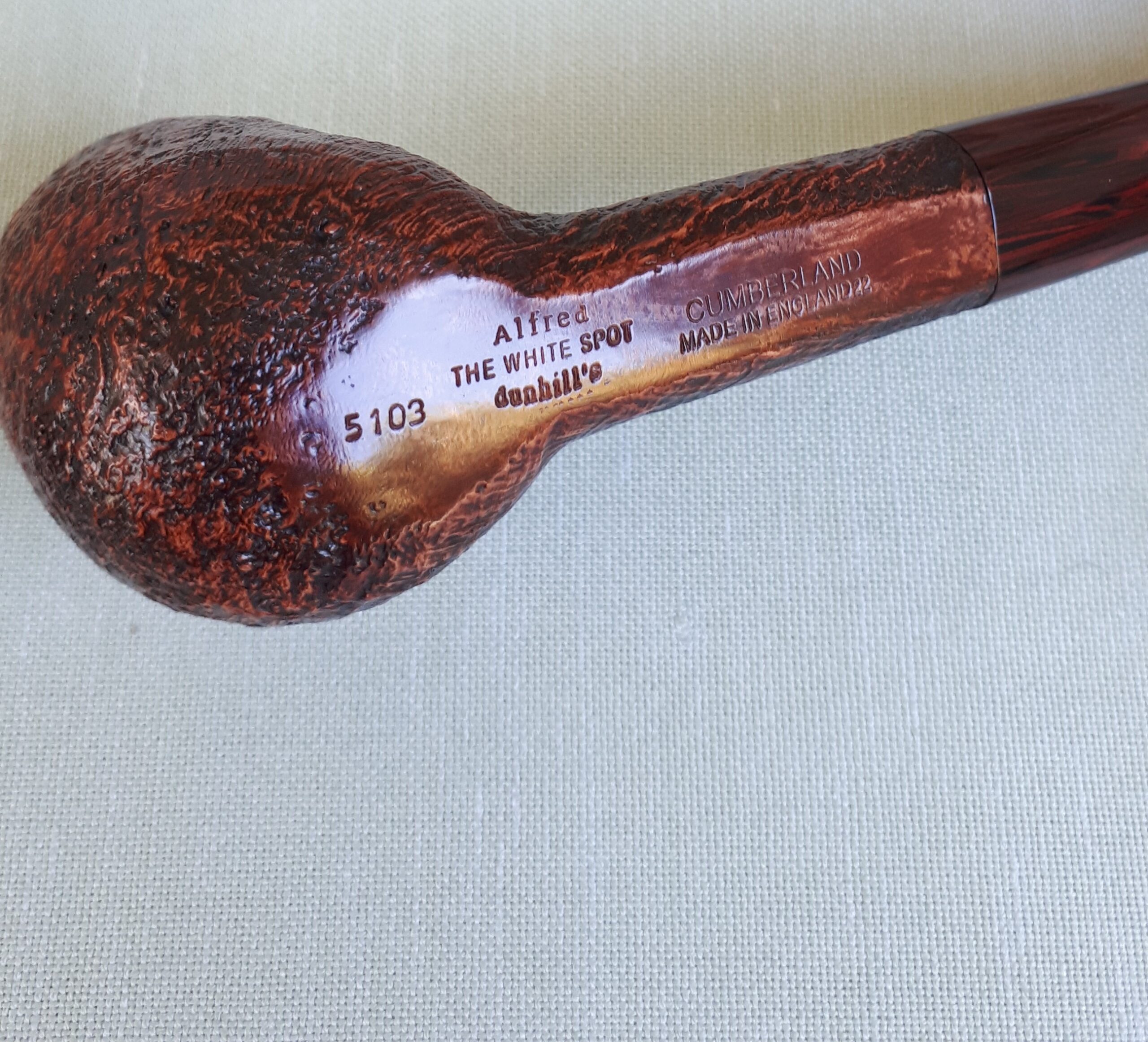 - This finish was introduced in 1980 and how beautiful it is. Rich, polished, oxblood-colour stain brings a glow to the deep sandblasted briar. And, I guess at the same time, a new, brown marbled colour vulcanite was developed to tone with the colour of the briar – they called it the “Cumberland” mouthpiece. To accommodate the stamping on a sandblasted pipe it is necessary to smooth and level the base of the stem. A benefit of this (possibly originally unintended) is that most sandblasted pipes, even the bents, can stand on their own. Irrespective of shape, size or finish, all Dunhill pipes are of one quality only – the finest.