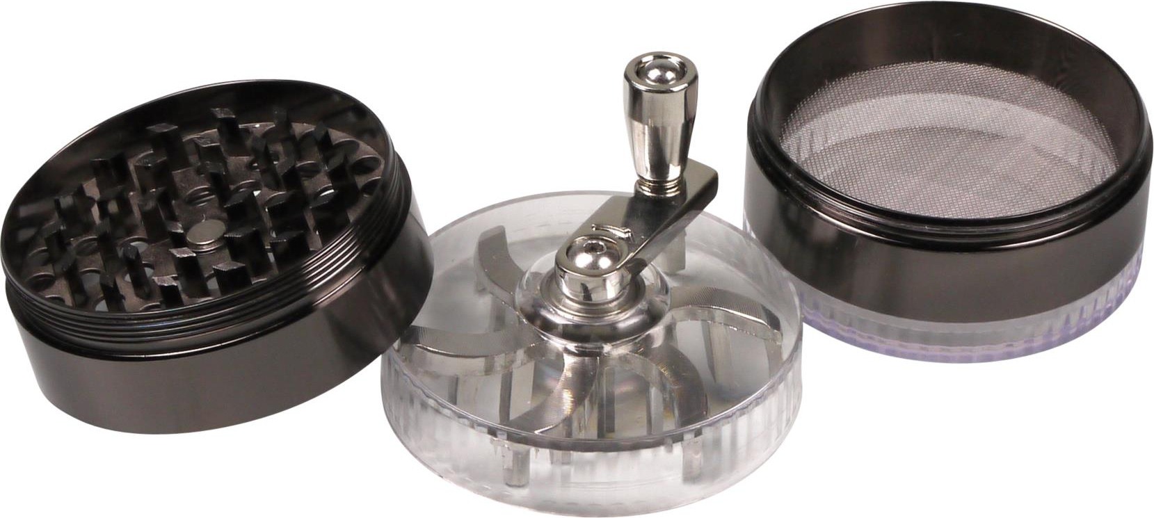Grinder, Metal/Plastic, Ht47x60mm, 4 part, Crank handle, screen, scraper